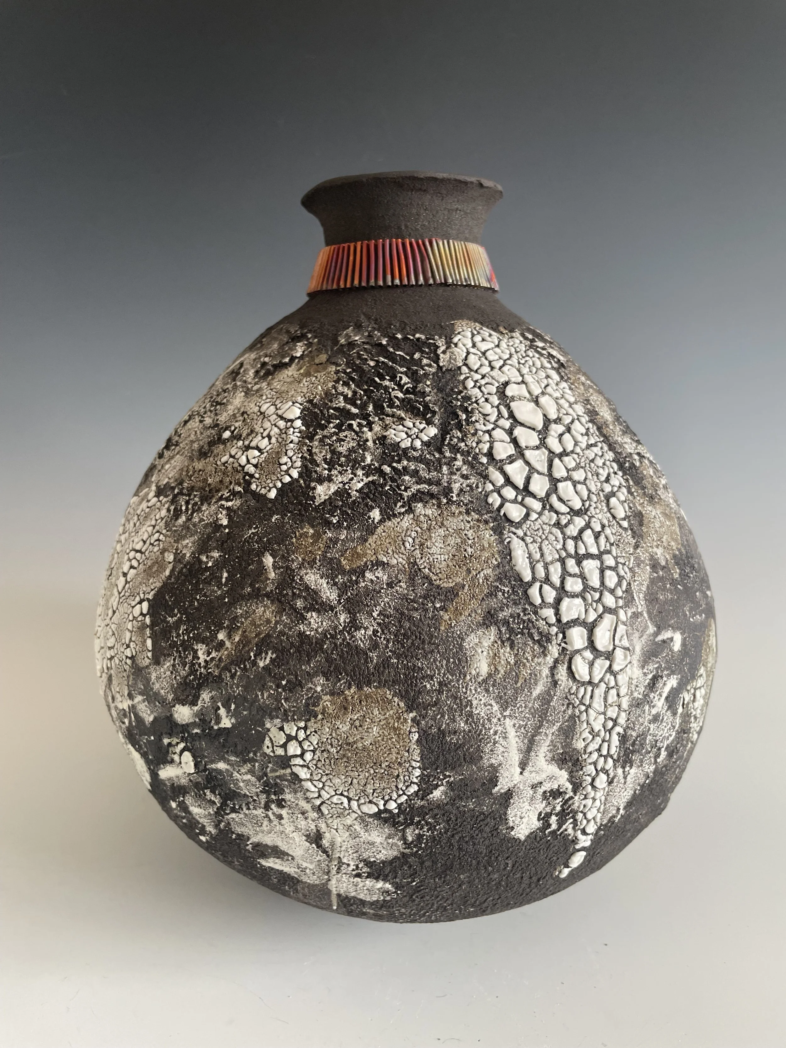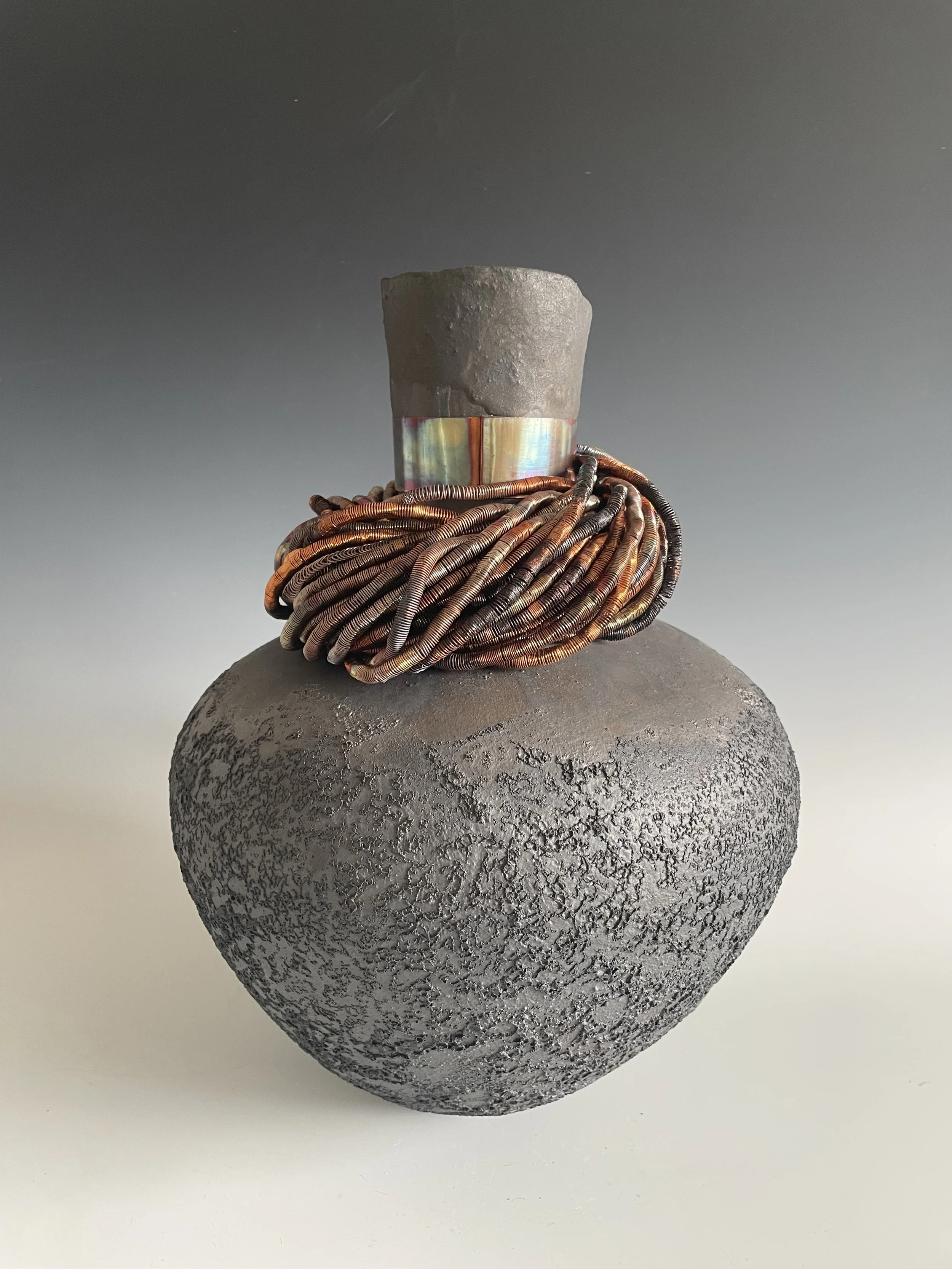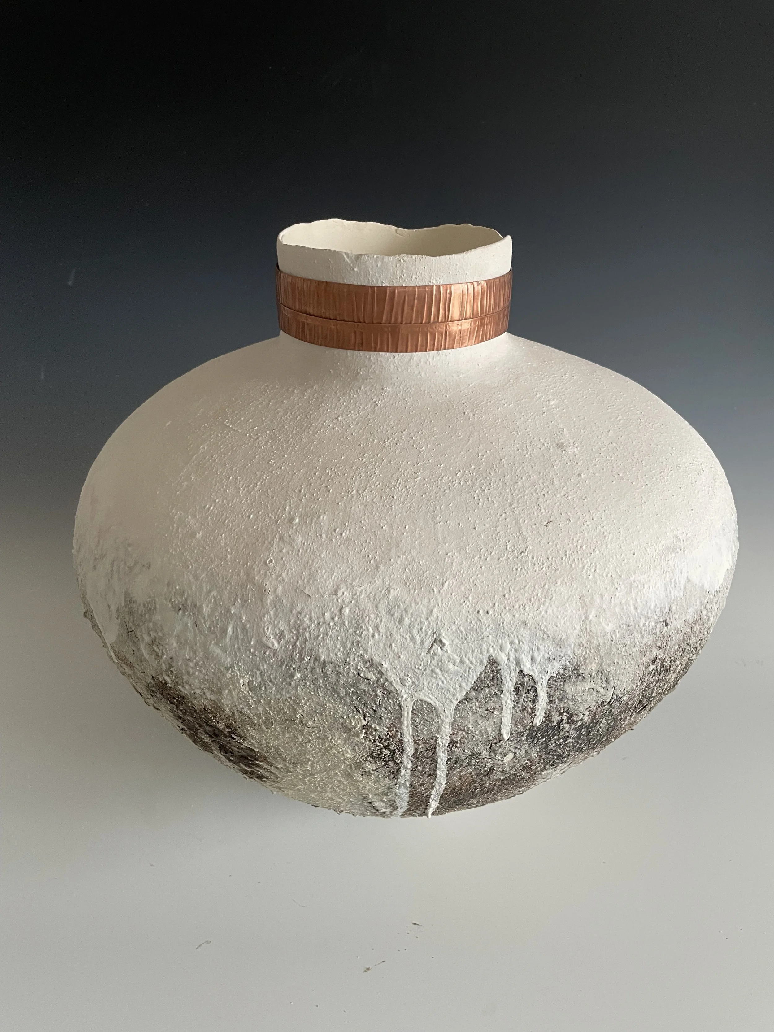These Water Carriers represent the precious and precarious nature of water. They are high fired and will contain water without leakage but the exterior surface treatment alludes to deserts and scarcity. The copper neck additions add a ritual element that refers to the precious and scarce nature of this water. They are hand built from a tough black or white stoneware clay and fired several times after applying a range of oxides, slips and glazes.